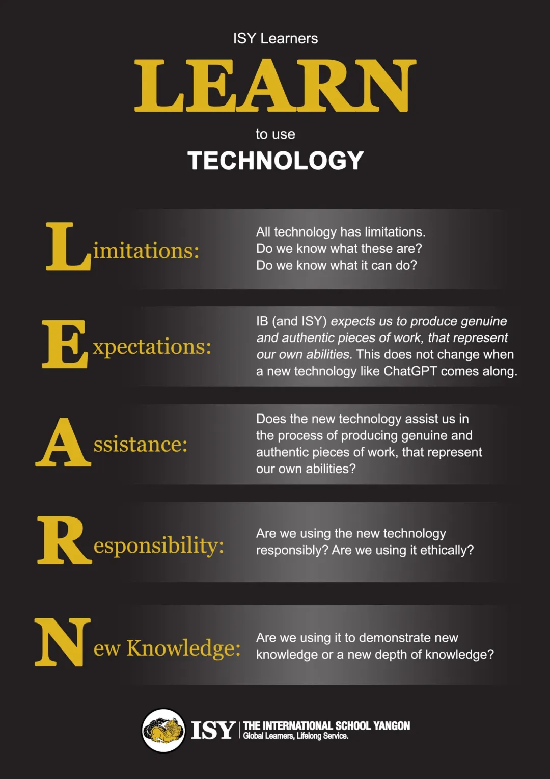 ChatGPT is a very powerful tool and, as with any powerful tool, students and teachers must use it with care and for the right purpose. How and why ChatGPT might be used in the classroom is something schools around the world have been thinking about a lot lately. At ISY we have been thinking about this in terms of our future focused Vision for our students.