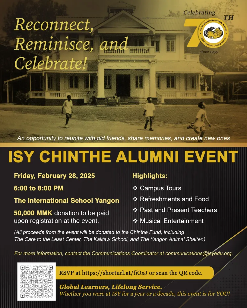 We hope the ISY Alumni Association will grow and develop a long-standing tradition of connection, communication and support. With the formation of this body, we hope to serve as a link to propel ISY into the future while maintaining our sense of pride as “Once a Chinthe, Always as Chinthe”.