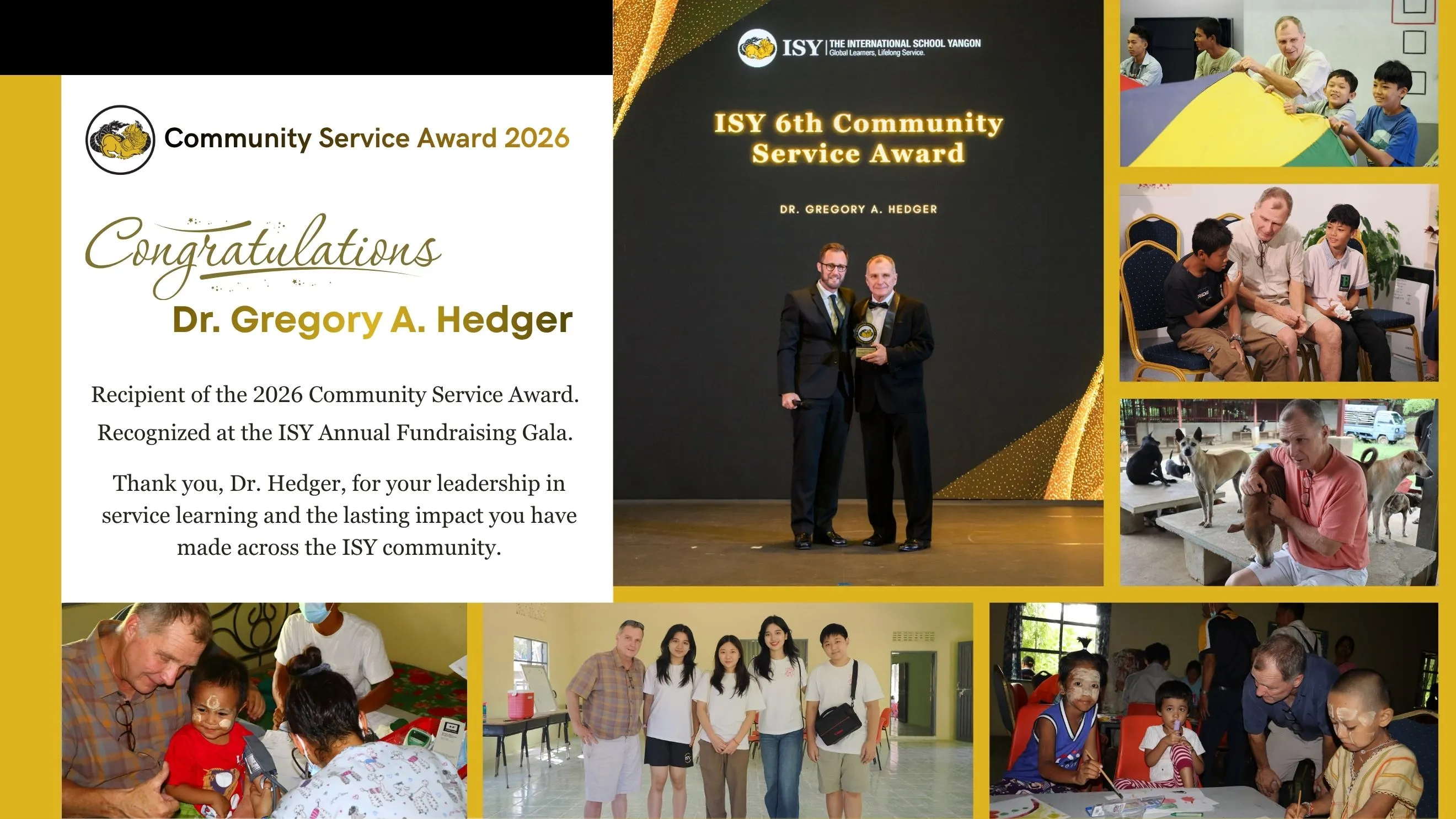 Dr. Gregory Hedger is recognized for his leadership in growing service learning at The International School Yangon (ISY) and for shaping a community where service is part of our school’s identity. A key part of this is the Chinthe Fund, which has become central to the school’s work, supporting children and communities across Myanmar through education, health, and wellbeing.